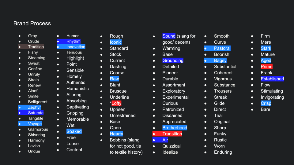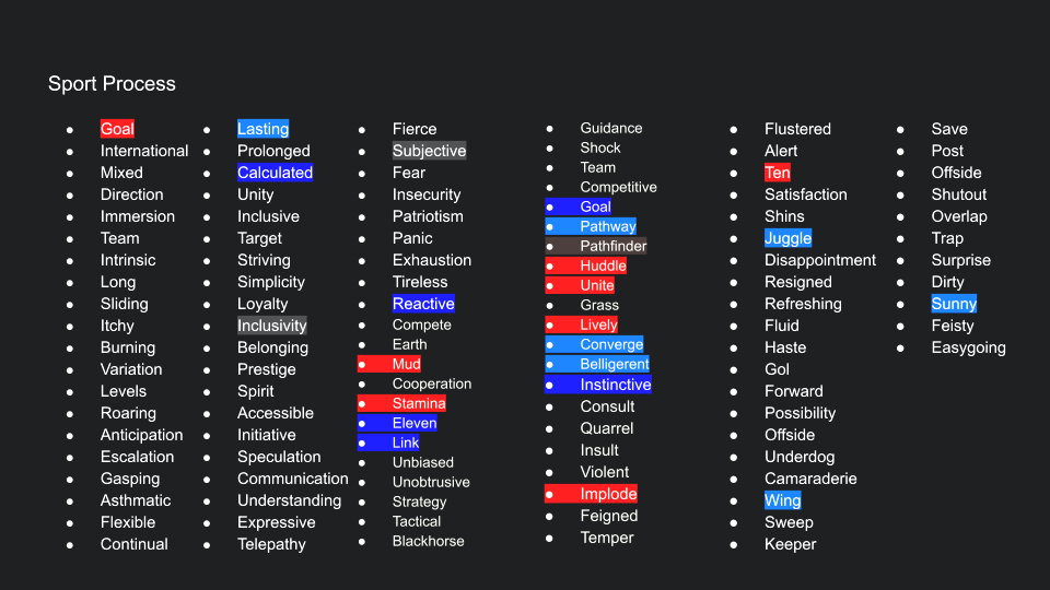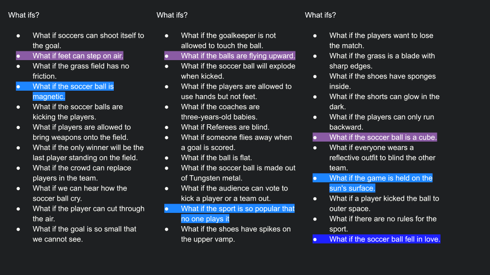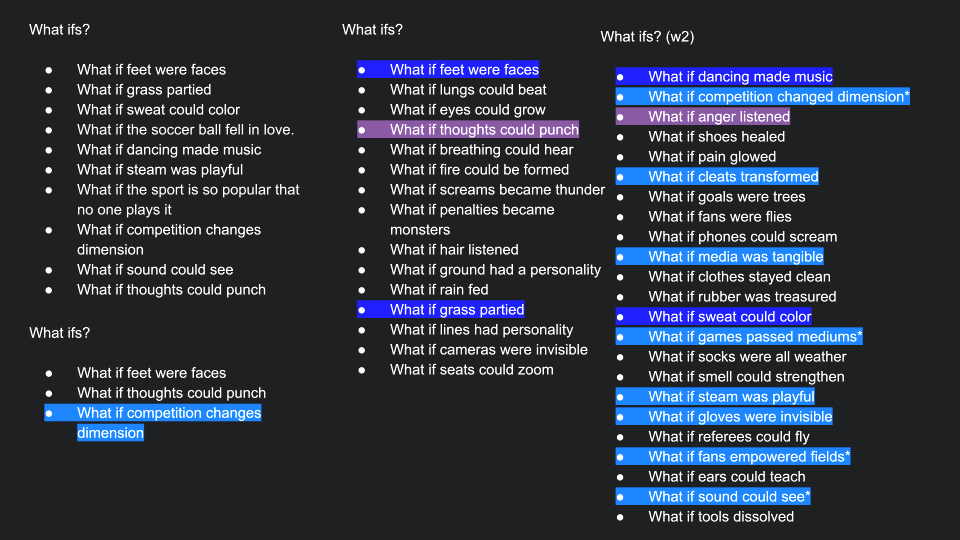 We start by generating three pairs of two-word-story to describe the brand, the sport, and the user. Then we generated "What if" and "How could we" questions from the stories. This is where we explore and identify problems to solve. Then we start to brainstorm and solve the problem while making sure the solution still follows the two-word stories to make sure we stay on the path.