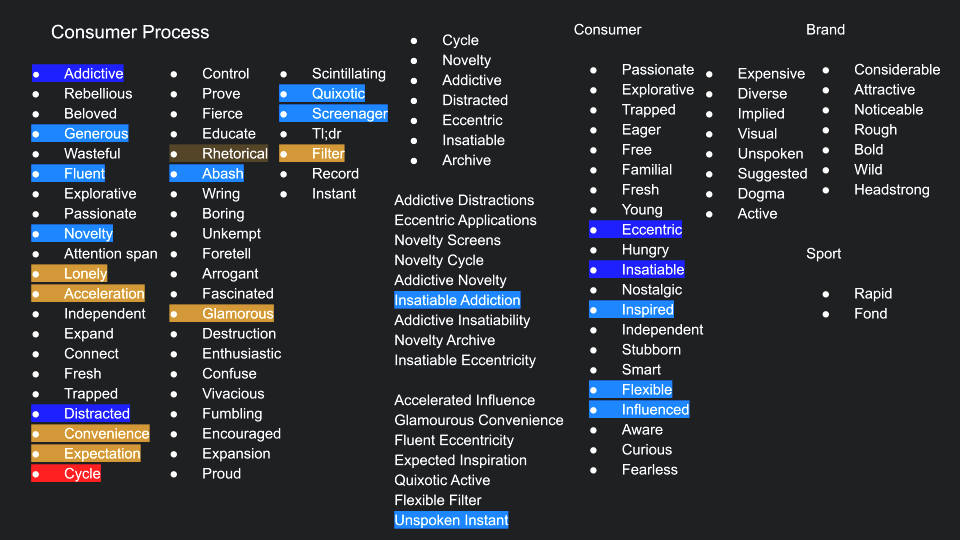 This project's goal is to explore a different way of discovering and solving problems. The traditional way is to start with market research and user interviews to form insights and identify pain points. This is a foolproof way of approach that works every time. However, this method often leads to marginal improvements because designers are limited to the problems their interviewees mentioned. Therefore, my instructor Kevin Beard leads me through a more poetic way of approach. This is a tortuous path but can indeed lead to dramatic and pioneering results. The first 7 weeks of work are group effort from Faith King and me. Then we separated to work on our independent project that is based on our previous group work.